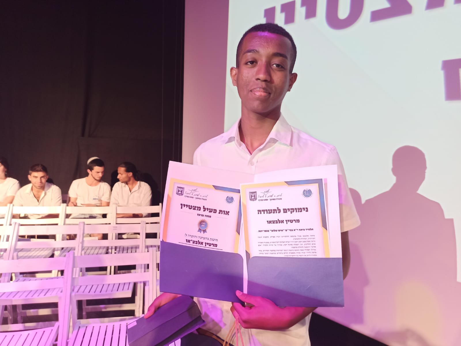 מרטין אלבצ'או, תלמיד כיתה י"א בתיכון איש שלום בכפר יונה, זכה באות הפעיל המחוזי המצטיין לשנת תשפ"ב; מרטין פעיל בתחומי מעורבות חברתית במסגרות החינוך השונות